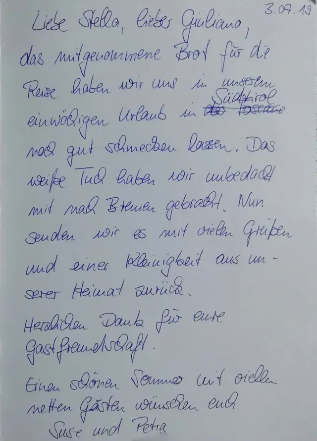 "Super Urlaub, grandiose Eindrücke, Super Unterkunft, unglaubliche Sehenswürdigkeiten" . Ausdrücklich wurde Eure Art der Gästebetreuung in höchsten Tönen gelobt von meinen Freunden gelobt. Ich selbst war auch angetan von Eurer offenen und liebenswereten und zuvorkommenden Art. Deshalb sage ich ganz einfach nur ein Wort: D A N K E (Grazie mille).