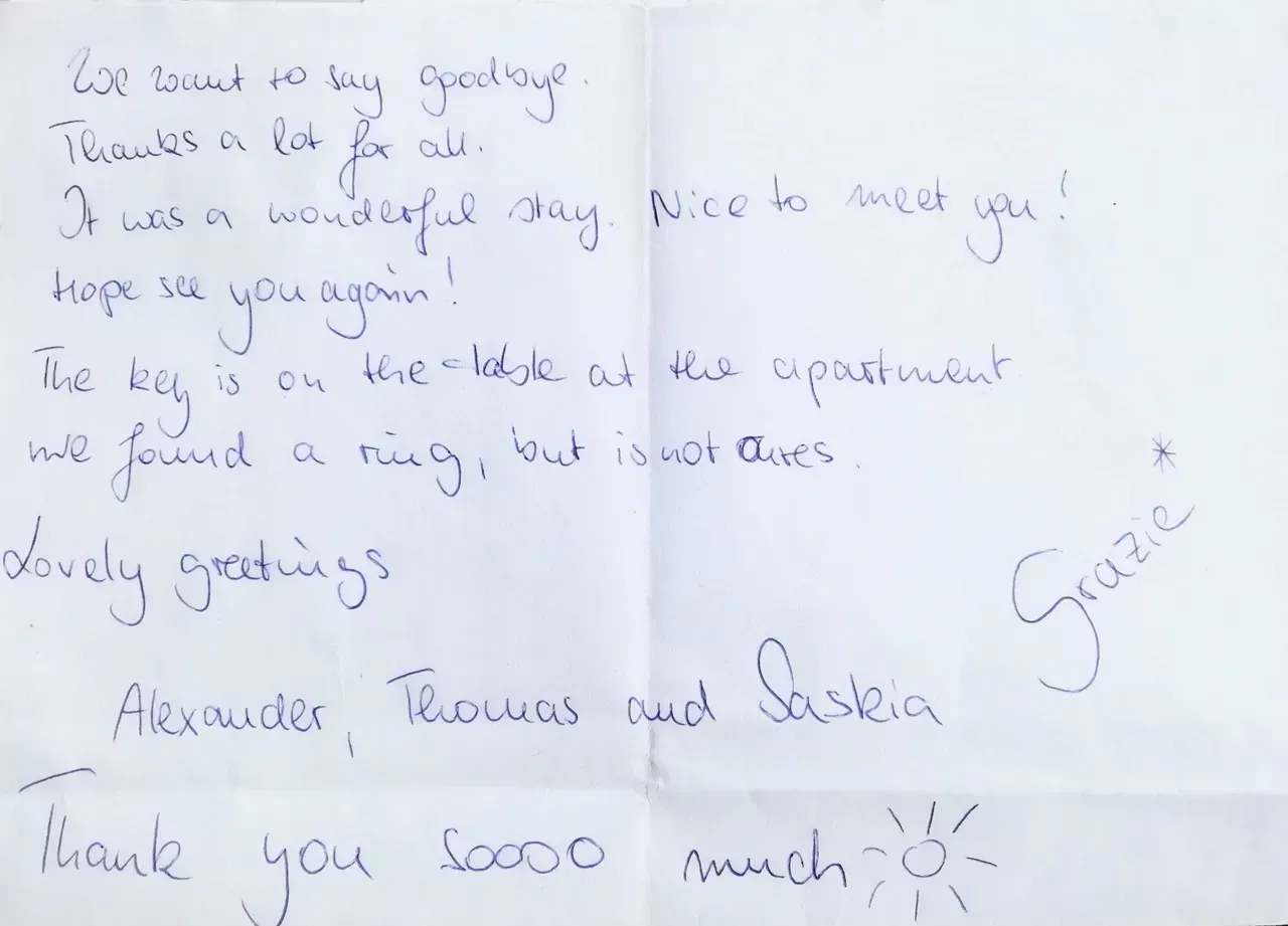 Wir kamen gegen 16 Uhr in der Unterkunft an und wurden von Stellas Mann begrüßt. Er war super freundlich und hat uns zum Apartment gebrach. Dort hat er uns alles gezeigt und uns für Fragen darauf hingewiesen, dass die Wohnung von ihnen direkt mit im Haus liegt und wir uns melden sollen, wenn etwas ist.